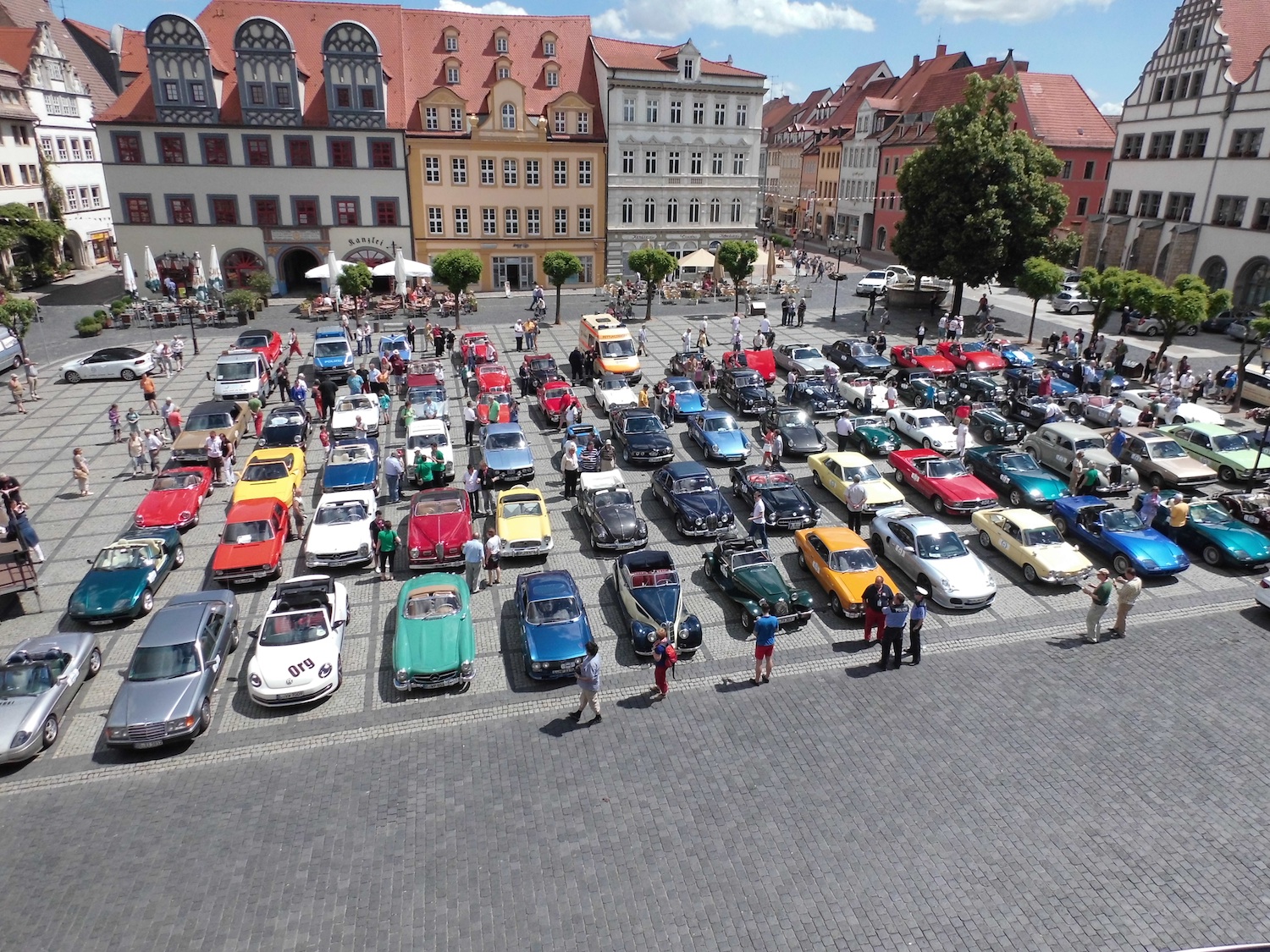 Einen halbstündigen Stop legten die Teilnehmer der 4th European Auto Classics Leipzig auf dem Marktplatz in Naumburg ein, bevor es weiter nach Gieckau zum Mittagessen ging. Bei schönstem Wetter parkten die "automobilen Träume von gestern, heute und morgen" in Reih' und Glied und wurden von den Umstehenden interessiert begutachtet.
