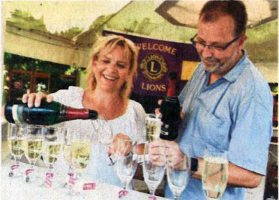 Saale-Unstrut-Weinkönigin Sandra Warzeschka und Gefolge stoßen mit Vize-OB Armin Müller und Weinbau-Chef Siegfried Boy auf das Festwochenende an. Am Stand des Lions-Clubs wird Rotkäppchen-Sekt ausgeschenkt. Der Erlös geht an eine Schule in Namibia. Ehepaar Schütte aus Hamburg lassen sich den Wein schmecken.